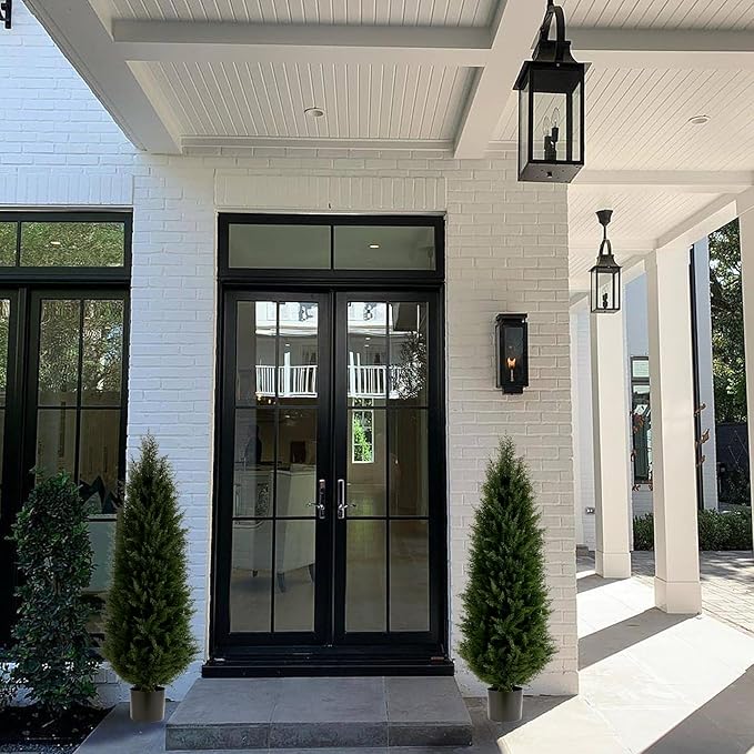 - 【Effortless Maintenance and Lasting Beauty】This evergreen artificial plants outdoor, perfect for your front porch decor, requires no upkeep—just a quick wipe with a damp cloth is enough to remove dust and keep fake trees looking vibrant. These cedar trees may have slight leaf deformation during shipping, a simple adjustment will restore it to its ideal shape