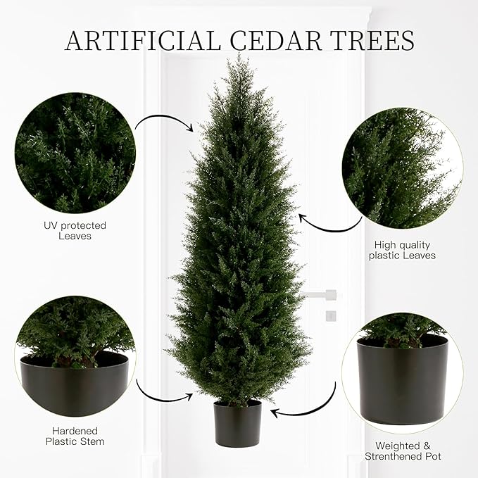 - 【Lifelike Artificial Cedar Trees】This 4ft artificial outdoor trees perfectly mimics a real cedar tree. Handcrafted by experienced horticulturalists using over 1,800 pcs plastic evergreen tips, this fake plant features natural colors and clear leaf vein textures. With fade resistance, insect protection, and UV resistance, faux cedar trees dense foliage allows for easy shaping while effectively concealing the trunk