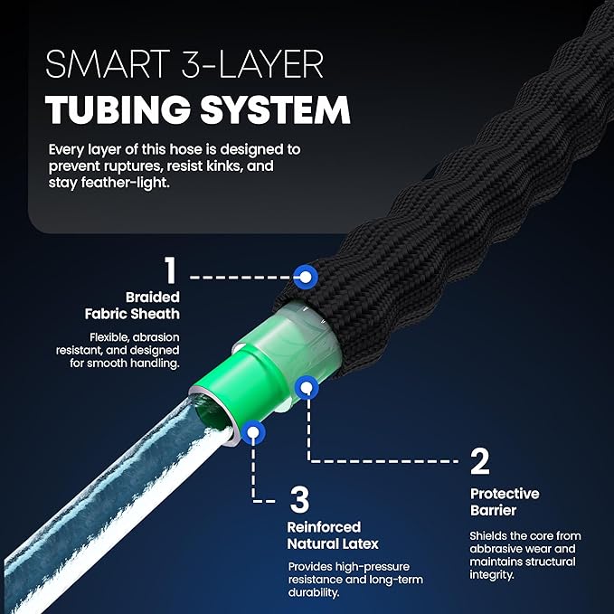- [Universally Compatible Kink-Free Design] Engineered with standard 3/4" GHT, corrosion free, pure brass connectors, our hose fits a wide array of faucets nozzles and accessories. The ultra flexible, never kinking design contributes to a hassle-free watering experience. The triple layer construction provides a durable and manageable garden hose with dependable performance in various weather conditions.