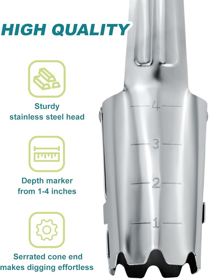 - MAKES PLANTING PROCESS SPEEDY AND EFFICIENT - Serrated-end, spring-loaded steel cone is perfect for removing soil and planting bulbs or other small plants in pots and flowerbeds. Simply press the bulb planter into the soil to the required depth, twist to remove a core of soil, pop the bulb into the hole, and replace the core. The planter is clearly marked with depth indicators up to 4 inches for precise planting.
