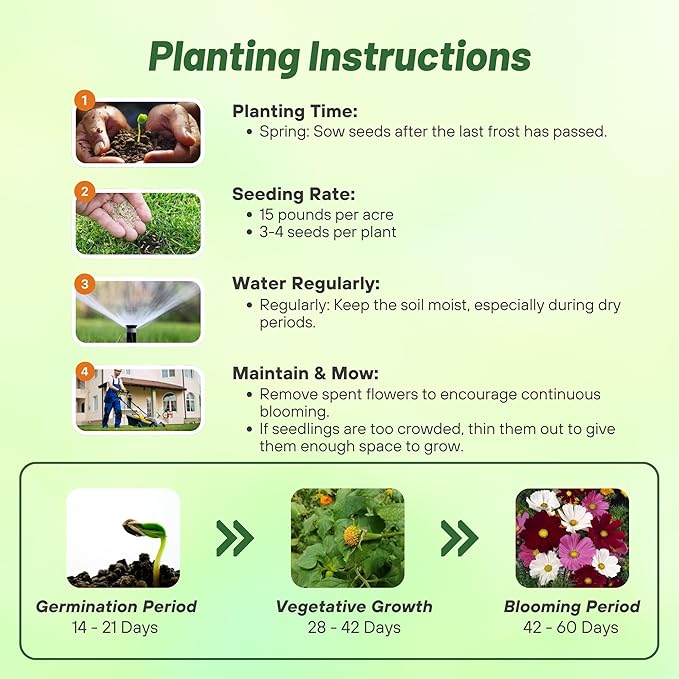 - LOW-MAINTENANCE & VERSATILE: Cosmos Bipinnatus seeds are known for being easy to plant and requiring minimal care. For best results, plant at a rate of 15 pounds per acre to create a lush wildflower display. Perfect for gardeners seeking low-maintenance, fast-growing wildflowers, they offer season-long color with minimal effort, ideal for borders, meadows, and beds.