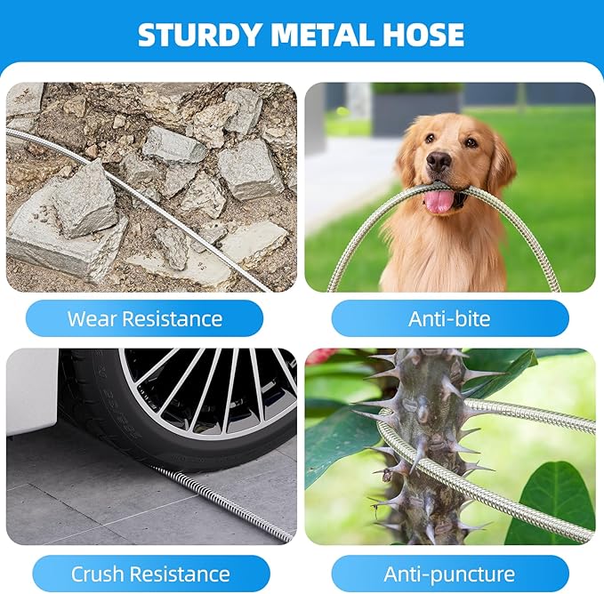 - Durable Garden Hose: Made of 304 stainless steel and multi-layer flexible inner tube, its structure is stronger than traditional rubber water pipes. Also it can withstand dog bite, dragging through wall edges and ground and will not break, crack or leak