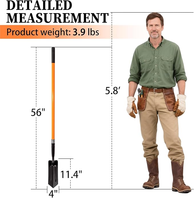 - Easy to Use: The 4 inch trenching shovel is 56 inches in length, but is lightweight at 3.9 pounds, so you won't be overworked while using it, and the longer handle reduces the bending angle and reduces back stress.