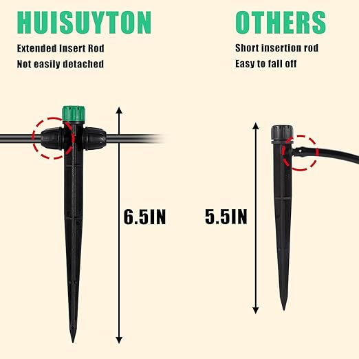 - Quick Connect Design: Upgrade drip irrigation emitter can be connected directly to 1/4" irrigation tubing,not easily detached.And it has been designed with an extended length of 6.5 inches.Easy to install without any other tools.Just push the tube firmly onto the barb and tighten the nut. Locks increases the tightness and will not leak.