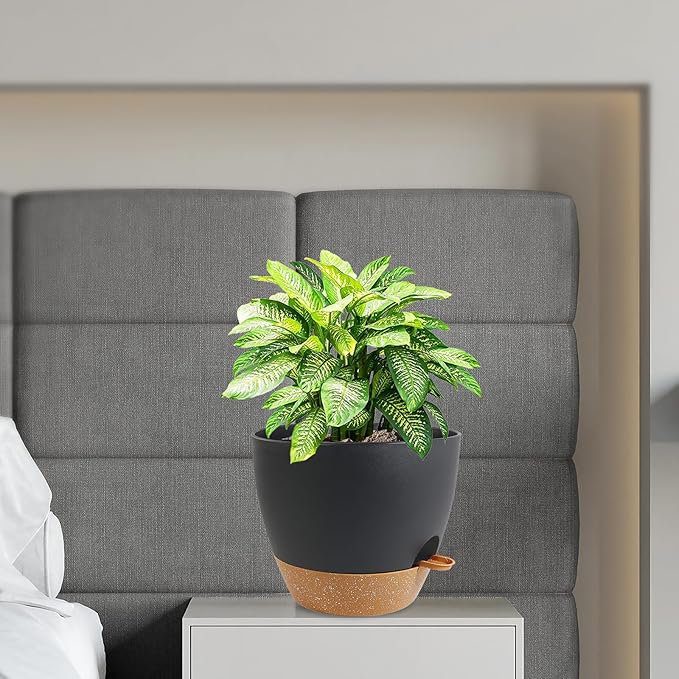 12 inch Large Self Watering Pots, Flower Plant Pots with Drainage Holes for Indoor Outdoor Garden Plants, Plastic Planters with Removable Deep Reservoir, Black with Brown