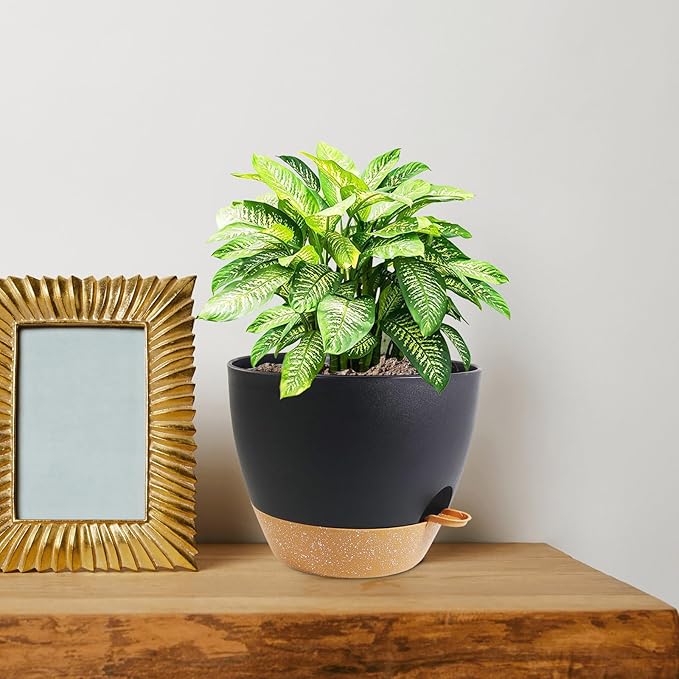 8 inch Self Watering Pots, 2 Pack Plastic Planters with Mesh Drainage Holes for Garden Plants and Flower, Plants Pots with Deep Reservoir for Indoor Outdoor Plants, Black with Brown