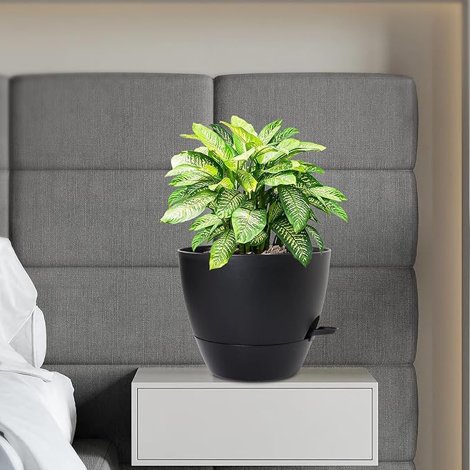 12 inch Large Self Watering Pots, Flower Plant Pots with Multi Mesh Drainage Holes for Indoor Outdoor Garden Plants and Flowers, Plastic Planters with Removable Deep Reservoir, Black