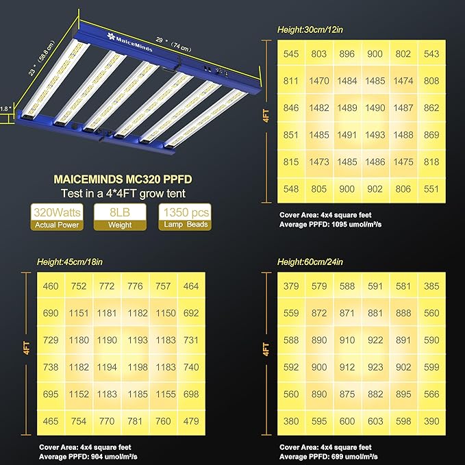 - 【High efficiency and economy】MaiceMinds MC320 plant lights for indoor growing Uses 1350 Samsung beads, with average PPFD of 1095 μmol/㎡/s and peak core PPFD of 1493 μmol/㎡/s in a 12in high 3x3ft coverage area.MC320 plant grow lights indoor With only 320w of power and a high energy efficiency of 2.8μmol/J, you can grow more plants with less electricity