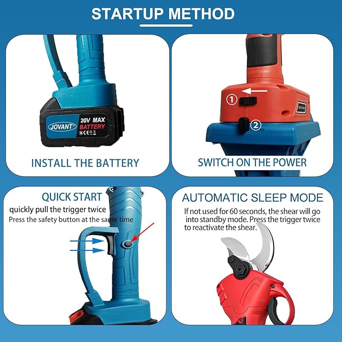- Electric Pruner with Two cutting diameters: Jovant Cordless Pruner has a maximum pruning diameter of 1.2″(30mm),which can reduce strain to safely cut off thick branches high up,and a half-open pruning diameter of 0.8″(20mm),which is more efficient,more power-saving, and quickly cuts through thinner branches.