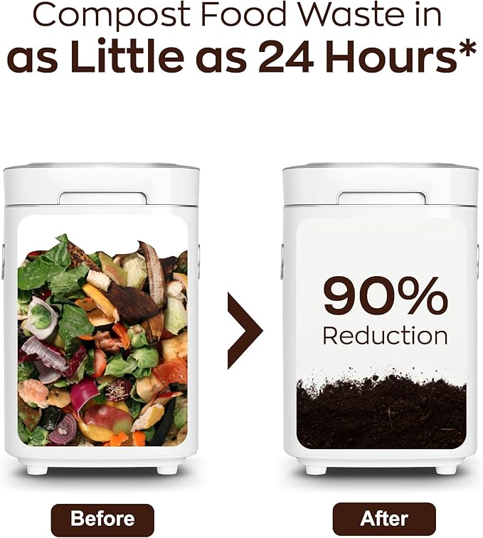- AEROBIC COMPOSTING: Reencle creates an optimized environment that speeds up the microbial decomposition of food scraps. Reencle Electric Composter revolutionizes the decomposition process by effortlessly transforming 2.2 lbs of food scraps into nutrient-rich fertilizer in just 2-24 hours! Say goodbye to long waiting times and reduce up to 90% of your food waste effectively.