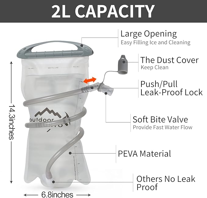 - đ´âăPremium Quality Water BladderăThe Hydration Pack Backpack comes with a 2 liter hydration water bladder and two 250ml soft flask. A switch valve and a cover cap make double leak-proof. Large opening allows quick filling of water and ice and it is easy to clean, the water line (40"length,0.4"diameter) provides a wholesome flow for easy drinking keeps your water tasting fresh, all day. The water temperature is range -20~+50â.