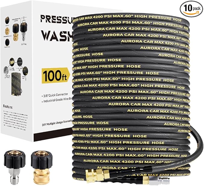 - Pressure Washer Hose 100FT: 100 Foot power hose is high tensile wire braided, it's durable and heavy duty, able to support quite high working pressure. Inner tube is reinforced with synthetic rubber. Its innovative high-tech materials and processes can extend the service life, suitable for household cleaning & commercial use