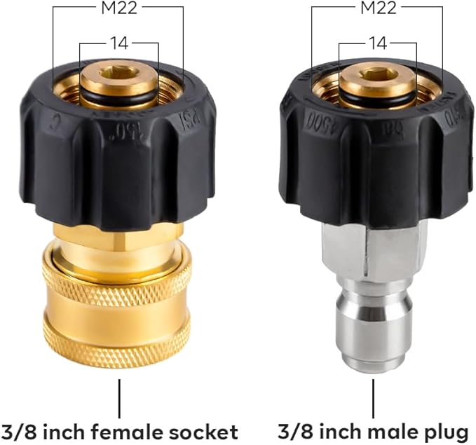 - Package Includes: 1 * steel wire braided 50 feet pressure washing hose, 1 * M22 14mm female to 3/8 inch male plug , 1* M22 14mm female to 3/8 inch female disconnect coupler. If you have any issues, please feel free to message us at any time, we're online 7x24 ready for warranty & support