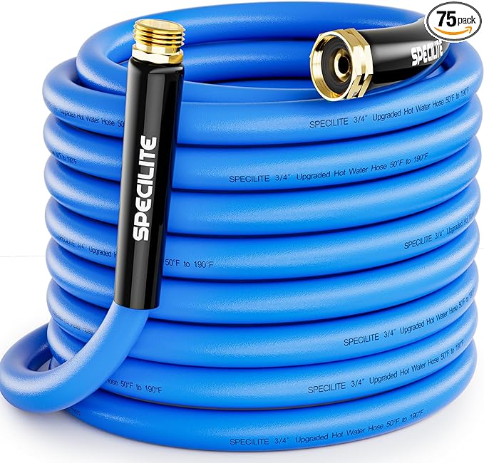 SPECILITE Hot/Cold Garden Water Hose 75 ftx 3/4 in, -50℉ To 190℉, Heavy Duty, Flexible, Burst 605 Psi, Lightweigh, Upgraded Rubber Pipe with 3/4" Brass Fittings For Backyard, Outdoor, Farm, Blue
