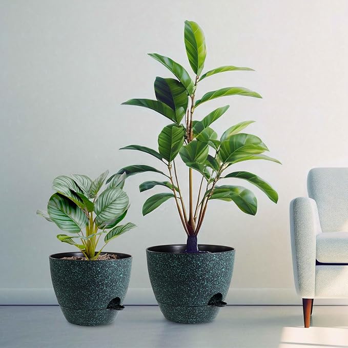 12/10/9 inch Large Self Watering Pots, Planter, Plant Pots with Mesh Drainage Holes for Indoor Outdoor Garden Plants, Plastic Flower Pots with Deep Reservoir, Black with Green Speckles