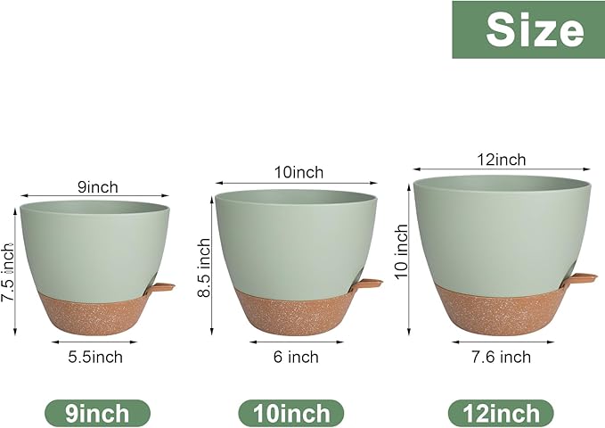 Plant Pots, Self Watering Planters for Indoor Plants with Drainage Hole, Plastic Flower Pot for Succulents, African Violet (Green, 12/10/9)