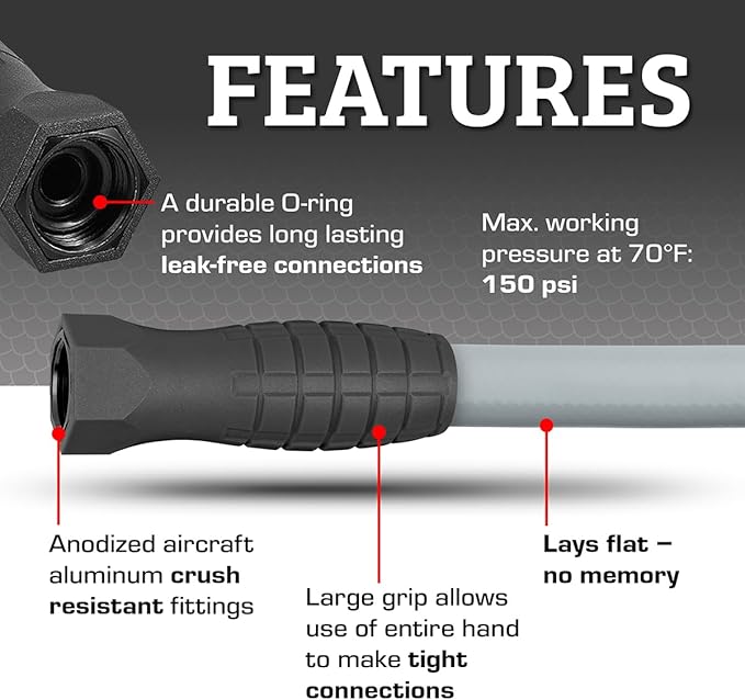 - Tight leak-free connections - Anodized aircraft aluminum ends and a durable O-ring provides long-lasting leak-free connections