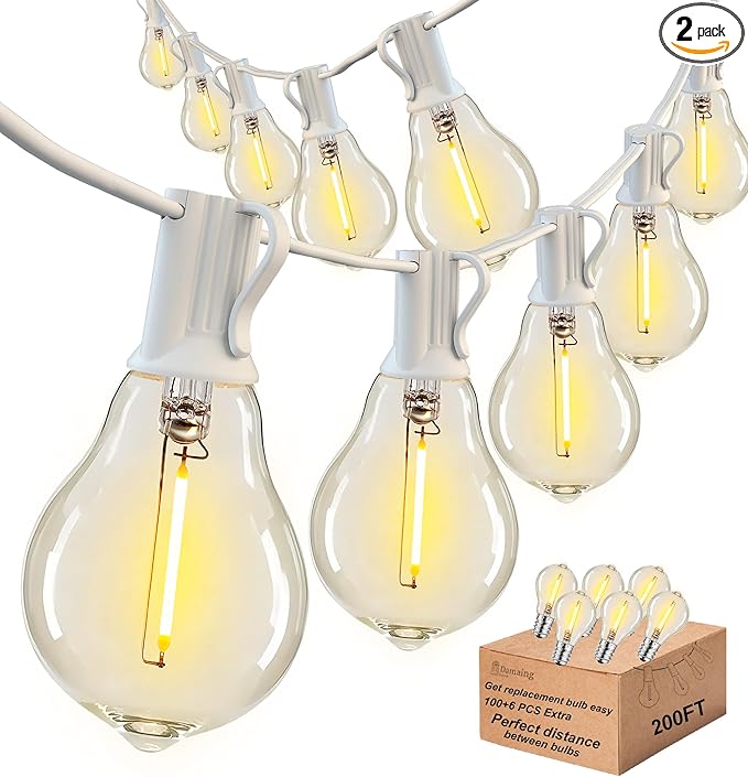 DAMAING Outdoor String Lights 200FT(2x100FT) Waterproof Patio Lights with 105 Plastic Dimmable LED Edison Bulbs,Connectable Outdoor Lighting for Backyard,Garden and Wedding Outside, 2200K White Cord