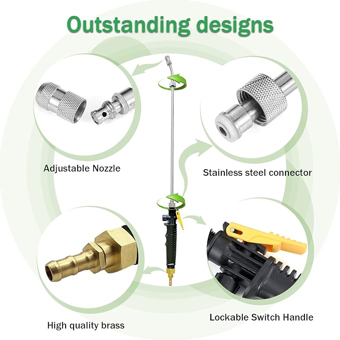 - 【3 Types of Nozzles Available】The sprayer wand kit comes with 3 types of nozzles: an adjustable stainless steel nozzle, a fan nozzle, and an adjustable 4-hole nozzle that can be changed for multiple spray patterns as needed.
