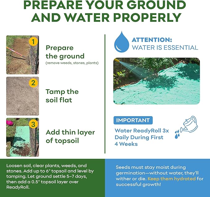 - Roll, Water, Watch: After the ground has been properly prepared by removing any plants or debris and loosening up the soil, simply roll out your grass patch repair, water consistently, and watch it grow! Don't forget to water at least 3-4 times a day for the first 3 weeks, ensuring the ground stays moist constantly.