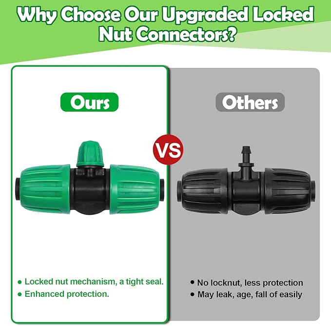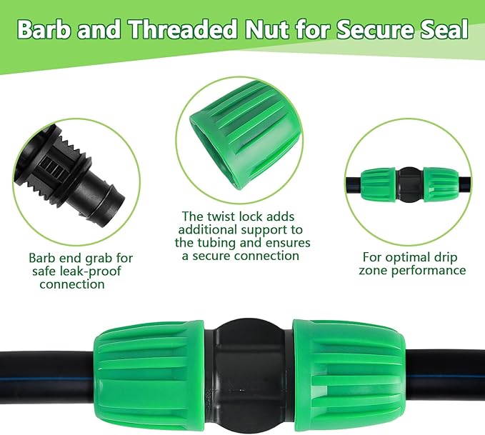 - 【Simple Installation & Leak-Free Operation】:The barb design of these 1/2-inch drip irrigation fittings offers a secure leak-proof connection, while the twist lock mechanism adds further stability to the tubing. For smoother insertion, consider heating the tube end in hot water for 10-30 seconds if needed.