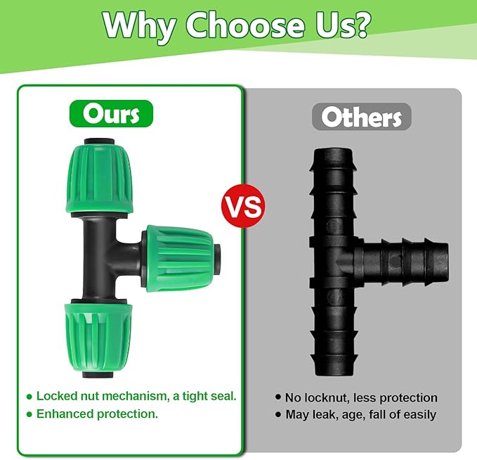 - 【High-Quality Drip Irrigation Tee Fittings】: Crafted from durable high-impact plastic and featuring an integrated design, these 1/2" drip line t connector are built to last without deformation or breakage. The barb design ensures a secure, leak-proof connection, while the twist lock mechanism provides additional tubing support.