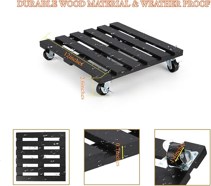 - 【Load up to 264lbs】Upgraded reinforced bottom slats and 360° rotating metal wheels are added in the middle of the square plant stand with wheels, the heavy duty plant caddy with wheels has a maximum load of 264lbs, which can hold various heavy items.