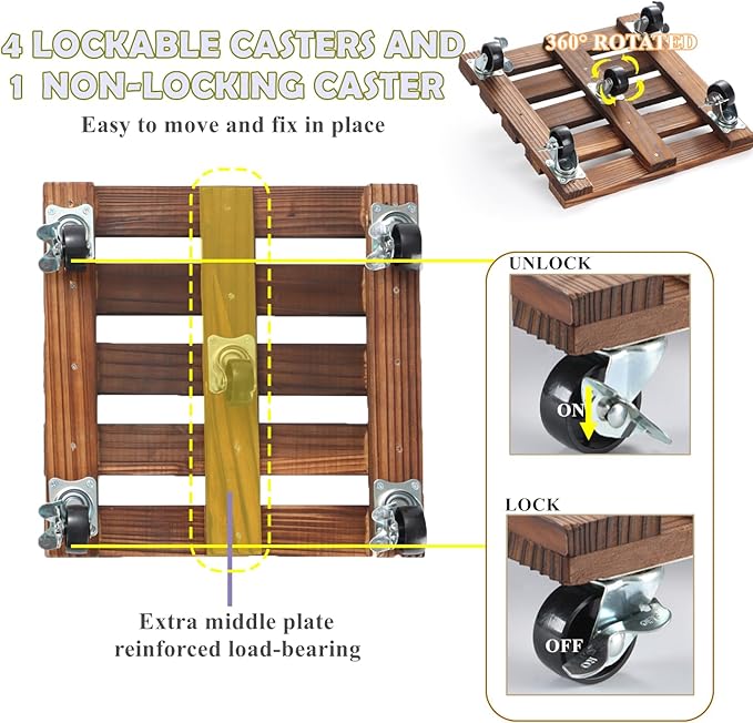 - 【360° Lockable Casters】rolling plant stand with 5 heavy-duty casters can roll smoothly and rotate 360°. Even heavy flowerpots can be easily moved around the house. 4 lockable wheels allow you to lock the flower/plant in place to prevent sliding.