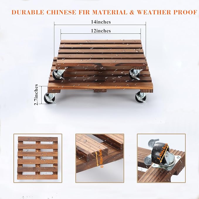 - 【Durable Material】plant caddy with wheels is made of chinese fir wood, which is corrosion-resistant, sturdy and not easy to wear and tear. It can stand the test of time and the outdoors. You can confidently use it to support heavy plant pots.