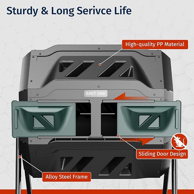 - 【Practical Dual Chamber Design】EAST OAK compost tumbler has two separate chambers, allowing one side to complete the composting process while the other side receives fresh scraps/clippings. This constant alternation ensures that your garden receives a constant supply of nutritious compost.