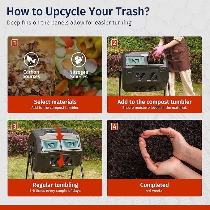 - 【Quick Process】Black color compost container can absorb sunlight, retains heat and speeds up composting. As long as you maintain the correct green/brown ratio, proper temperature and humidity, there will be no odor and the composting will be completed in about 4-6 weeks.