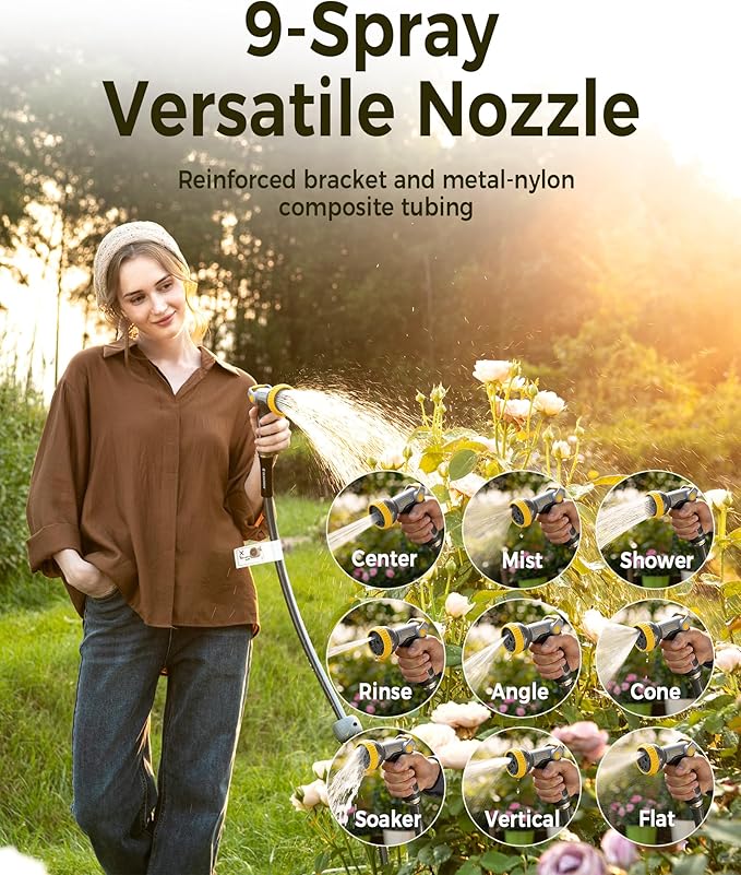 - 9-Spray Versatile Nozzle: Switch between mist, jet, fan, and 6 other patterns for gardens, cars, or cleaning. Ergonomic non-slip grip enhances control