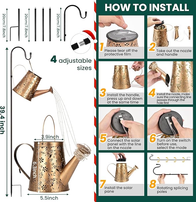 - Dimensions and Specifications: The solar garden light is made of durable metal, including the watering can body, spout, and handle. It comes with a ground stake composed of five 7.8-inch sections, allowing you to customize the height as needed