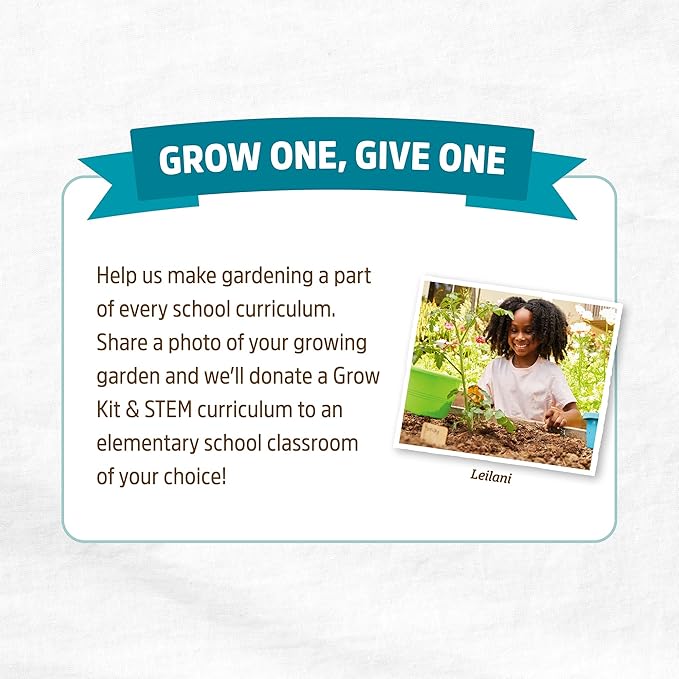 - GROWONEGIVEONE — Share a photo of your growing garden and we’ll donate a Kids Grow Kit and STEM elementary school curriculum to a classroom of your choice.