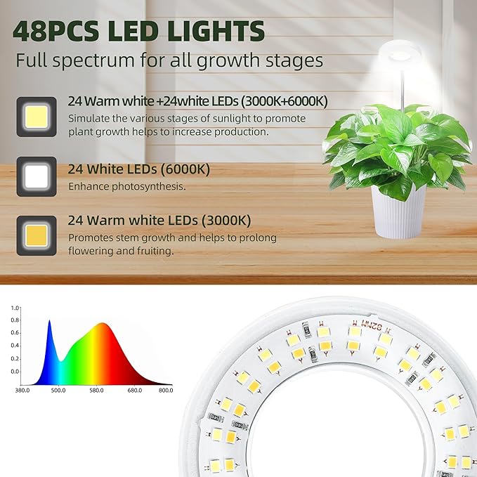 - FULL SPECTRUM LAMP: Our grow lights for indoor plants with 24 White LEDs + 24 Warm White LEDs, it's similar to the natural daylight at noon, professionally designed for indoor plants, flowers, herbs and so on. Moreover, the light is soft and flicker-free, which is very suitable for reading lamp.
