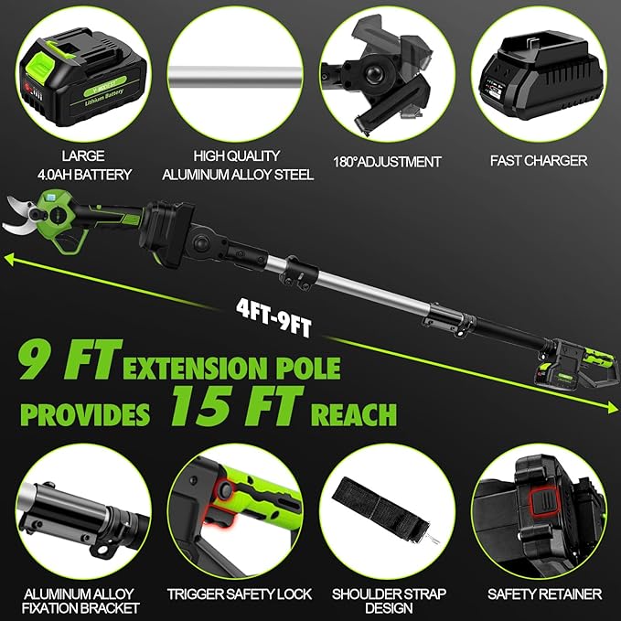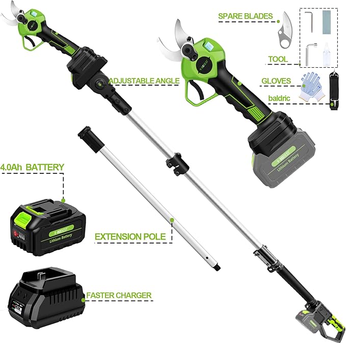 - 【2-IN-1 DESIGN】 2-in-1 pole pruner combines an electric pruning shear with a sectional extension pole to provide a versatile tool for garden pruning. The cordless pruner can be used for low-level work, while the sectional extension pole can be used in hard-to-reach high areas.