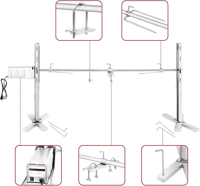- [Durable Spit Rod ]:The 52” rotisserie Grill Kit long spit rod can roast pigs, lamb, chicken, turkey, pork shoulders, or anything that weighs up to 150-pounds.