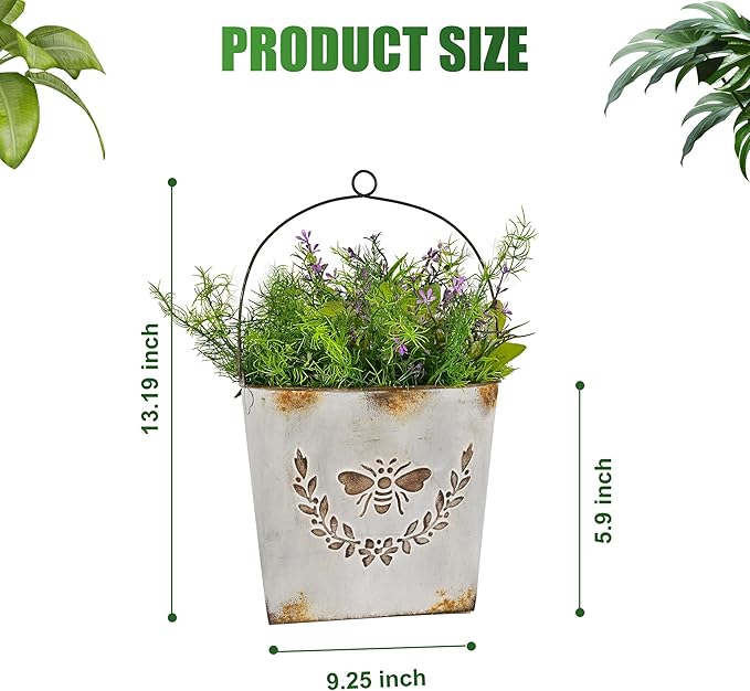 CVHOMEDECO. Farmhouse Wall Mount Metal Flower Pots Rustic Galvanized Bee Flower Holder Wall Hanging Pocket Planter for Indoor, Outdoor and Wall Decor, Set of 2 (Grey)