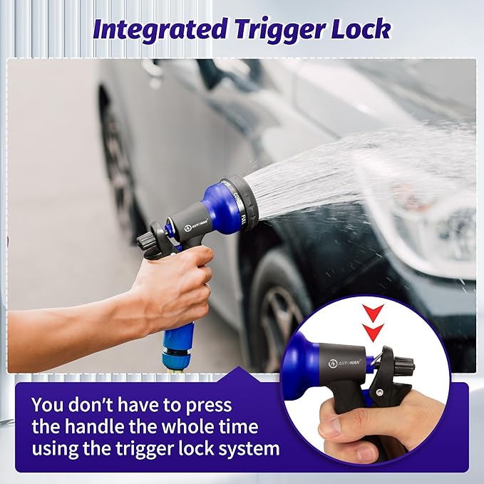 - Labor-Saving Design: AUTOMAN garden nozzle features a nice lock bar at the top of the handle that keeps the water remains on without you having to apply any pressure.Just use the lock so you don't have to keep your hand holding it the whole time.
