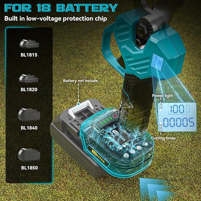 - 2000mAh Capacity Dual Battery: Equipped with a 18V 2.0Ah battery for extended use, this pruner can operate continuously for up to 3 hours on a full charge. Now, with the inclusion of two 2.0Ah batteries, it can be also compatible with Makita pruning shears battery, you have the flexibility to swap batteries without downtime. The rechargeable batteries feature self-overload and temperature protection for enhanced longevity.