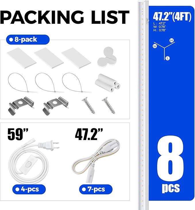 - What You Get: 8 x Barrina T5 Grow Lights, 4 x Power Cords with ON/OFF Switch, 7 x Connecting Cords (47.2''), 8 x Small Connectors, 16 x Installation Clips, 16 x Double-sided Tapes, 24 x Cable Ties, 8 x Dustproof Cap