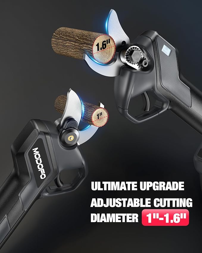 - ๐ POWERFUL CUTTING CAPACITY UP TO 1.6" & ADJUSTABLE MODES: Upgraded for superior performance! Engineered with premium SK5 blade material, our cordless pruning shears deliver clean and precise cuts. Two cutting modes allow you to trim branches up to 1" or 1.6" with ease, giving you optimal control and flexibility for all your gardening needs.