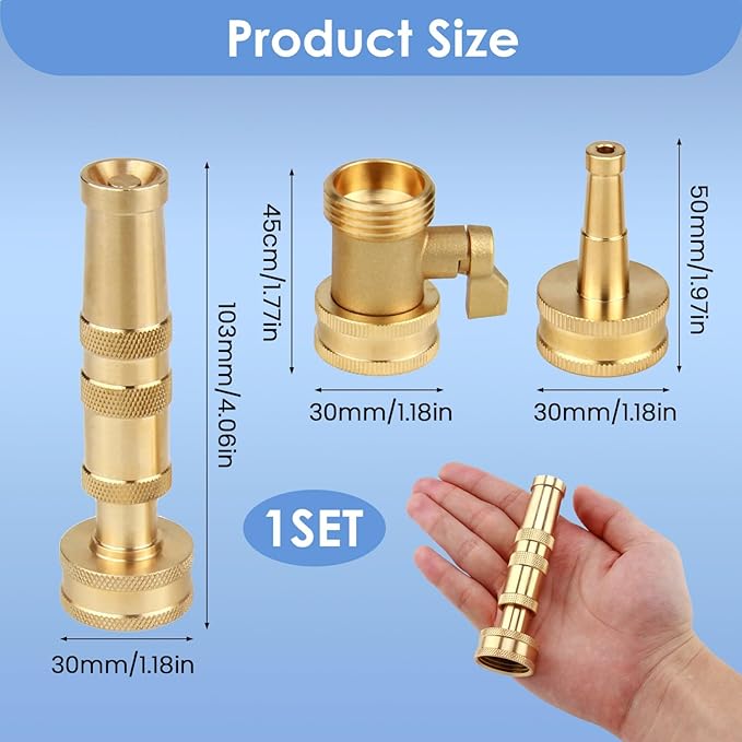 - Contents of the Package: Should you have any issues, feel free to reach out. Your package includes: 1 brass hose shut-off valve, 1 brass garden hose nozzle, 1 brass jet sweeper nozzle, and 2 extra rubber hose washers