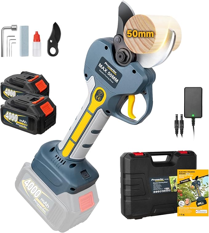 - 【Prunes 5CM Branches in a Single Clean Cut】Prunarbo battery pruning shears can effortlessly tackle branches of 50mm diameters in just 0.8 second. PR-E50 professional electric pruner offers adjustable with selectable 30mm and 50mm cutting diameter settings, delivering fast and ensure a clean-cut for healthier plants. It is specifically designed for professional orchardists to effortless prune oak, maple, cedar and fruit trees like citrus, apple, cherry, peach, grape.