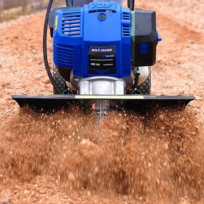 - Powerful 46cc 4-Stroke Engine - Delivers 1,400W peak power at 9,200 RPM max, smoothly breaking through hard soil with consistent performance. Its no-mix fuel system (gas and oil separate) minimizes maintenance demands, while the precision-balanced engineering ensures low vibration, minimal noise, and low emissions for a fuel-efficient, eco-friendly operation.