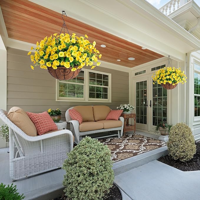 - High Quality: The fake hanging flowers are made of high quality silk and plastic that look real and stylish. Artificial hanging flowers for outdoors are UV resistant, sturdy enough for any weather. The faux hanging flowers will keep vibrant colors for a long time and blooms all seasons.