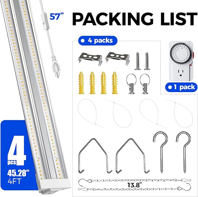 - Flexible Installations & Linkable Design: The Barrina TX72 full spectrum grow light supports hanging and surface mounting. With chains, hooks, anchors, cable ties, and clips, installation is quick and easy. Link up to 4 lights with 57 inches cords and individual on/off switches, ensuring comprehensive light coverage for your indoor vegetable garden