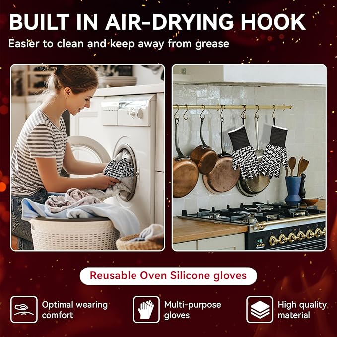 - VERSATILE AND PRACTICAL — Perfect for grilling, cooking, frying, and baking, these cooking gloves offer excellent dexterity with their fingered design. These guantes para el horno ensure a secure and flexible fit, ideal for both kitchen and outdoor tasks. They provide strong heat resistance and flame-retardant protection to help you handle hot surfaces safely. While they resist flames, direct and prolonged contact with fire may damage the gloves’ outer layer and reduce their performance