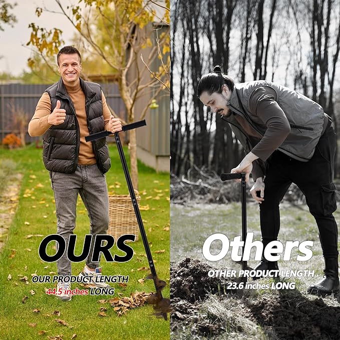 - 【T-shaped Auger Drill&Twist Tiller】T-shaped Auger Drill has 4-stage detachable connection structure, with 2 different heads, post hole digger and twist tiller, total length is 44.5 inch, diameter is 4 inch, which can be adjusted to a suitable height for work, can keep you away from the waist pain caused by bending over to plant vegetables or flowers. The handles is made of a non-slip material which does not strain your hands much and also provides a good grip to your hands.