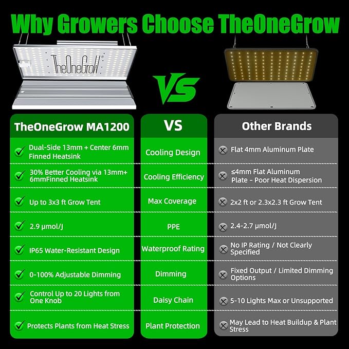 - 【High-Efficiency Grow Light with 30% Higher Yield】 TheOneGrow MA1200 replaces traditional 250W HPS/MH lights with only 120W power draw, cutting energy consumption by 50% while boosting yields by up to 30%. Ideal for growers looking to maximize yield and efficiency in grow tents, vertical racks, or decorative home gardens.